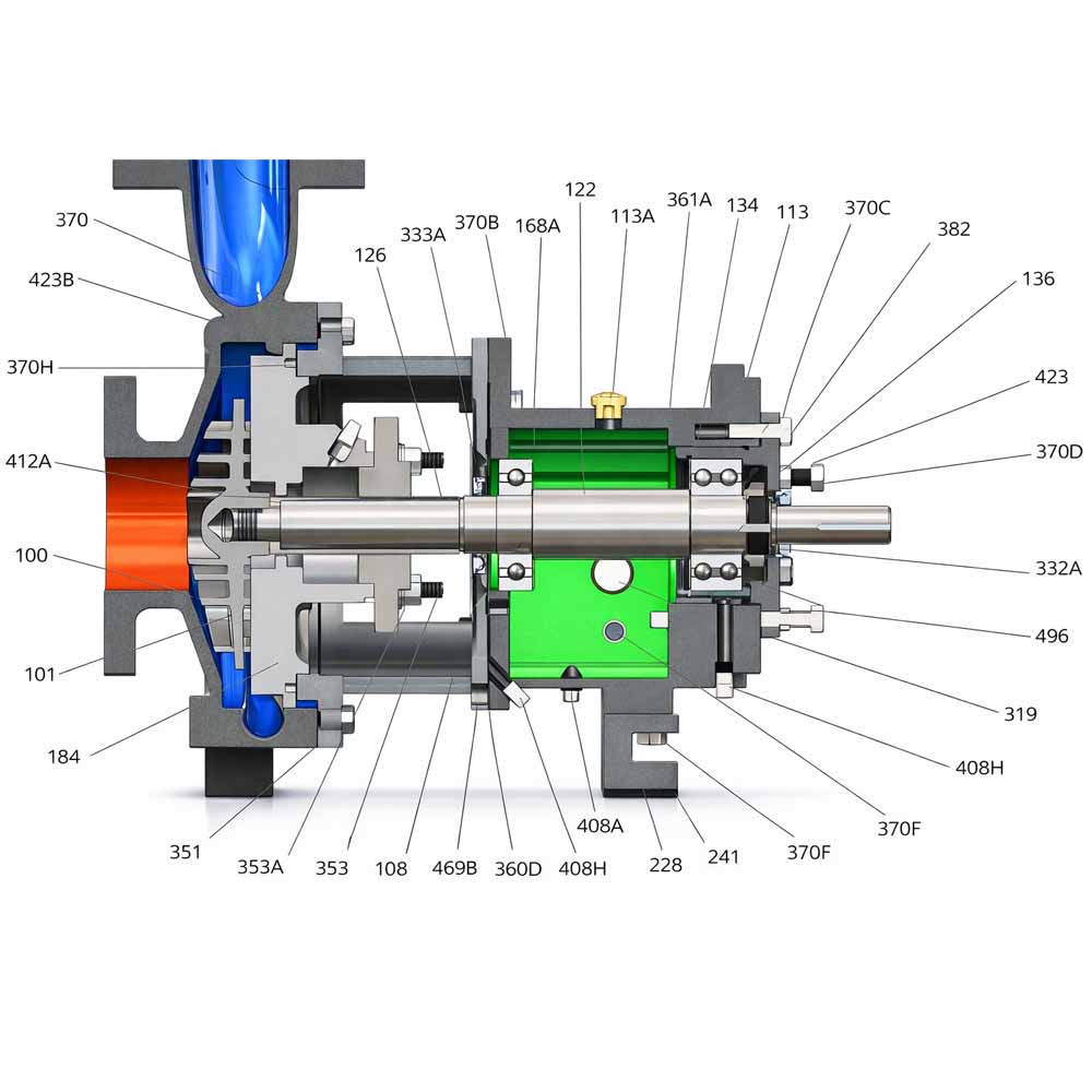 El impulsor está diseñado para proporcionarte un flujo constante y eficiente, permitiéndote bombear líquidos de proceso limpios o con presencia moderada de sólidos, siempre seleccionando el material adecuado para tu aplicación. Gracias a su diseño hidráulico, obtienes un equilibrio óptimo entre eficiencia energética y desempeño.